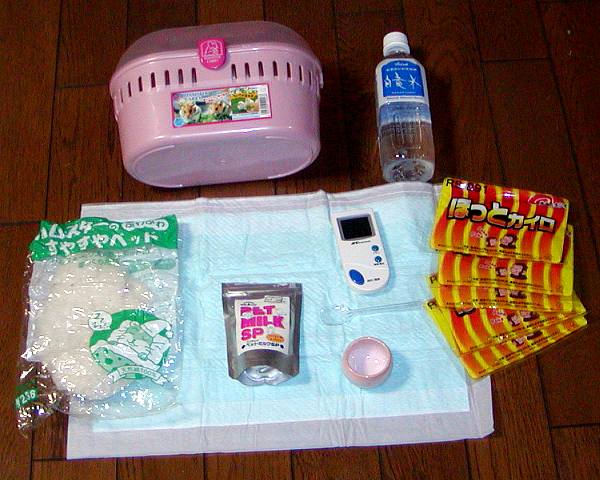 ほかに、移動ケージ又はプラケース・保温用にペットの綿、又は布団綿(脱脂綿やボール状になった色付きはNG)と使い捨てカイロ(貼るタイプはNG)を用意しておいて下さい。