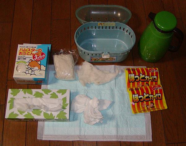 - 準備したもの -・移動ケージまたはプラケース ・ペットシーツ ・綿(わた:ハムのすやすやベッド) ★脱脂綿は水分を吸収するので避ける★ ・使い捨てカイロ ・ペットミルク(森永ワンラックペットミルクSP) ・ミネラル水(水道水のカルキ臭を嫌ってみた) (お急ぎの時は80度位のお湯を用意) ・ケージカバー ・あと、あれば温度湿度計 (湿度計はなくても温度計は欲しい) |