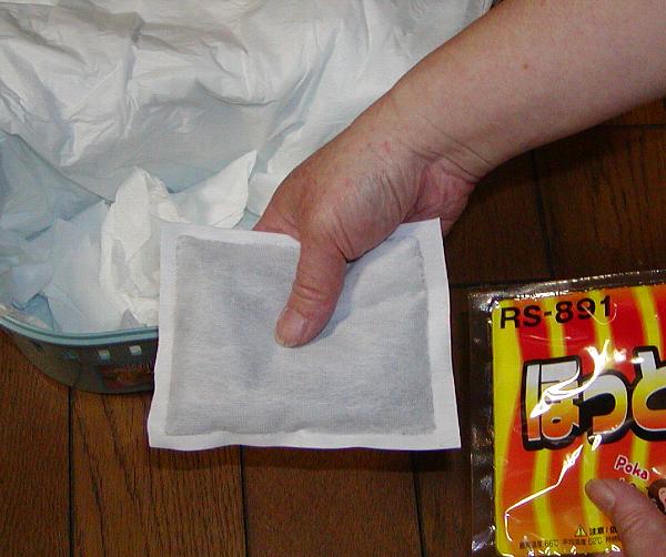 − 手順 4 −暖めておいた使い捨てカイロをその上に載せる。 |