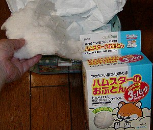 − 手順 6 − 吸収性が低い天然綿を用意しておく。 ティッシュペーパーの上に天然綿を軽く乗せるように 敷く。(脱脂綿だとペットシーツの湿気を吸ってしまい、 体温低下の原因になるので、綿実油を微量含んだ 天然綿を使用) |